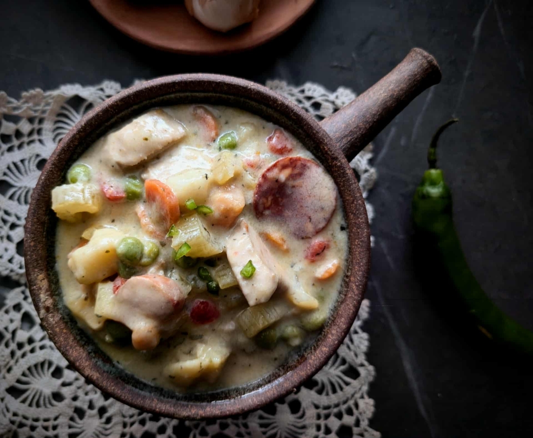 Kevés olívaolajon megdinsztelem a felvágott hagymát, szárzellert, sárgarépát és paprikát. Felöntöm az alaplével, hozzáadom a megtisztított és kockákra vágott kétféle krumplit, a zukkinit, a lengyelkolbászt, a kakukkfüvet és a zsályát. Ez az a pillanat, amikor érdemes szétnézni a hűtőben, s ha találunk szikkadó kolbászvégeket, száradó sajtokat, azokat is felkarikázva, lereszelve beletehetjük. Nálam néhány karika parasztkolbász árválkodott, be is kerültek a serpenyőbe. Amikor elkezd főni, beleteszem a húst vagy tofut, fedő alatt készre főzöm (kb. 20 perc). Ha a hozzávalók megfőttek, a lisztet kevés vízzel simára kavarom (gluténmentesen étkezők használhatnak kukoricakeményítőt), a tejszínnel együtt hozzáadom, a zöldborsót is beleszórom. Amennyiben húsmentes változatot készítek, ekkor teszem bele a főtt babot, lencsét vagy csicseriborsót. Egy-két perc alatt besűrítem, sózom, ha még szükséges.