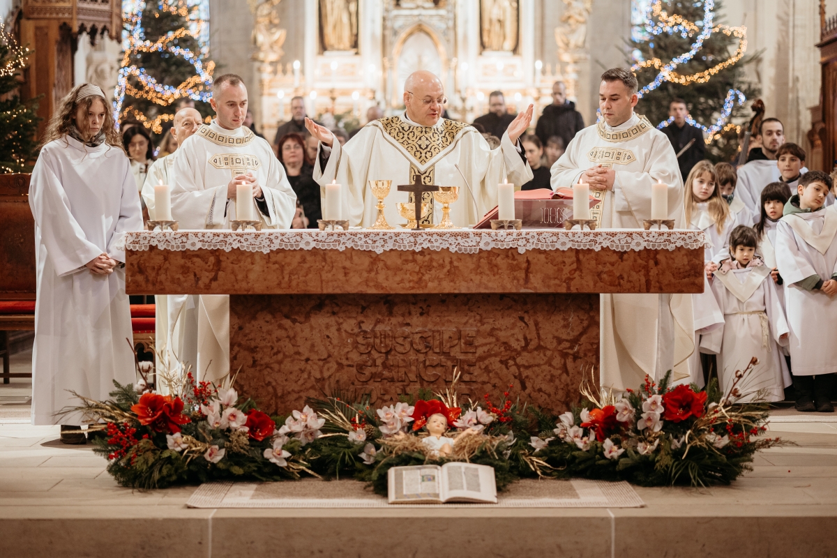 Másnap, karácsony főünnepén László Attila főesperes-plébános mutatta be a délelőtti szentmisét, koncelebráltak Bőjte Csongor és Czirják Ottó segédlelkészek. Szentbeszédét László Attila többek között ezekkel a kérdésekkel indította: „Ki az, aki tényleg akar/elfogad egy gyermeket? Vagy magát az Istent? Egy gyermeket, akinek életében ma is az Isten megosztott élete lesz valósággá, jelenvalóvá. Karácsony annak kérdését is hozza: ilyen egy gyermekváró – Istenváró társadalom? Ilyen egy család, mint a tied, mint a miénk?” Majd így folytatta: „A választól függetlenül itt van az öröm ideje. Mert a karácsony üzenete az, hogy mindegy, hogyan akarjuk mi egymást, az Isten akar minket! Sorsunkkal, életünkkel – sőt –, halálunkkal együtt. S mert az ember szíve mélyén ott a vágy Őutána, mindig voltak és lesznek, akik elindulnak, akik megállnak, akik meglátják egymás szeme csillogásában a földöntúli fényt; mindig lesznek, akik kihallják a hírhozó hangot: ember, veled az Isten!