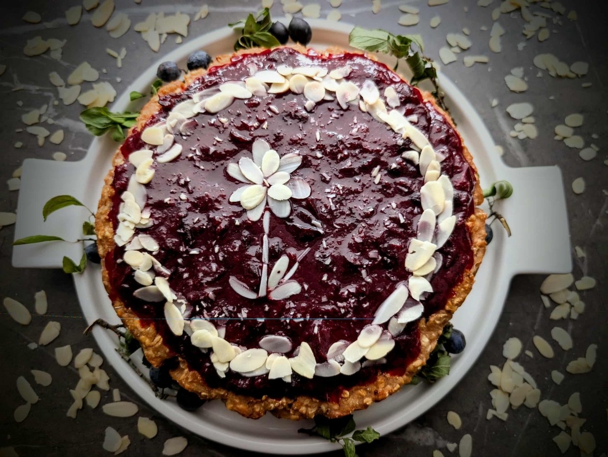Utolsó lépésként a két masszát összekeverem, sütőpapírral kibélelt tortaformába öntöm, és 180 fokon 40-45 perc alatt készre sütöm. Hagyom kihűlni. Ezt követően megkenem a tetejét kökénylekvárral, majd tetszés szerint díszítem. Jelen esetben a díszítés mandulaszeletekkel történt. Nagyon finom, aromás különlegesség kerekedett belőle. A lekvár savassága kiegészítette a túrós-zabpelyhes tortalapot. Mert a kökénynek puhára főzve és megcukrozva is van ereje, azaz éle, akarom mondani fanyarsága. No, de ettől finom, ettől különleges.