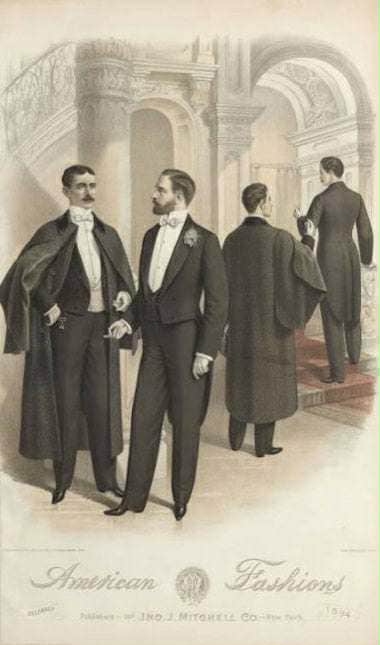 Az 1860-as évektől a férfi viselet fokozatosan sötétebb tónusokat öltött: a rikító színek háttérbe szorultak, s a mindennapokat a szürke, a barna, a sötétkék és a fekete öltönyök uralták. Maga az öltöny is ekkor, 1865 táján vált általánossá, három része és egységes anyaga tovább erősítette a színek egyhangúságát. A nappali öltöny mellett divatba jöttek a kontrasztos zakó–nadrág kombinációk, nyáron világosabb változatban, estére pedig a frakk és az ünnepi nadrág párosítása számított elengedhetetlennek. Egy átlagos férfi ruhatárát fehér, keménygalléros ingek, plasztronok, állógallérok, mandzsetták, mellények, különféle nyakkendők és csokornyakkendők egészítették ki. A fehér mellénnyel, cilinderrel és lakkcipővel viselt frakk továbbra is a társasági öltözködés szigorú kelléke maradt.