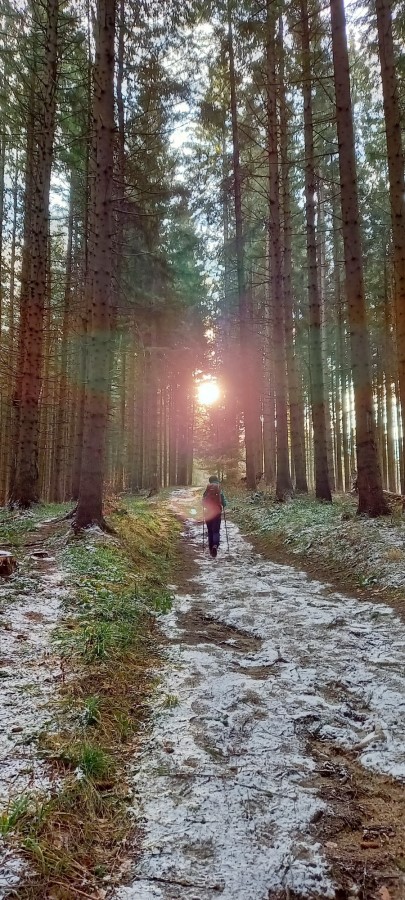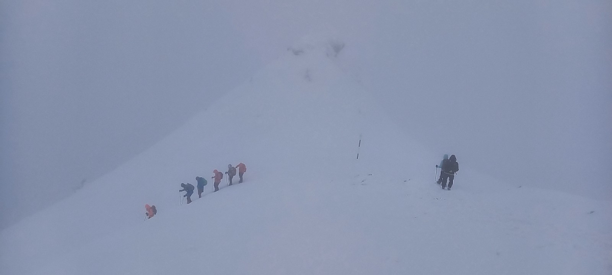 Borongós idő és köd kísérte az utunkat előbb a lombhullató fák között, majd a fenyőerdőben, ezt követően pedig az alpesi tisztáson teljesen hatalmába kerített a hó. Azonnal tudtuk: védekeznünk kell a hó és a köd eredményezte teljes fehérség, az úgynevezett whiteout ellen, amely a téli magashegyi túrázás és alpinizmus egyik legveszélyesebb meteorológiai-percepciós jelensége, mert nem pusztán rossz látási viszonyt jelent, hanem az emberi érzékelés teljes összeomlását is okozhatja.