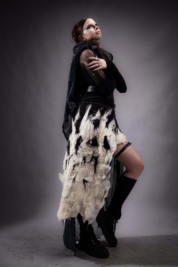 A feladat egyetlen megkötése az volt, hogy a fő alapanyag a gyapjú legyen (gézzel kiegészítve), valamint, hogy a megvalósítás legfőképp a fekete-fehér színvilágra épüljön. A diákok ezen felül mindenben szabad kezet kaptak. A munkafolyamat első lépése a tervezés és inspirációgyűjtés volt. Az ötletek bárhonnan jöhettek: Pinterestről, más online oldalakról, filmekből, videóklipekből, vagy akár az utcáról. A tervek kidolgozására egy hét állt rendelkezésre, amit a kivitelezés előtt a kurzusvezető tanár is ellenőrzött. A konkrét munkafolyamat a nemezeléssel és a gyapjú festésével kezdődött. „A feladat ezen része igazából kifejezetten hamar ment. A tartós ruhadarab nemezelése hosszabb folyamat, mivel ott fontos az anyag keménységének elérése. Viszont a posztapokaliptikus témához hozzáad az, ha a nemezelést nem tökéletesítjük és foszladozó, kézművest hatást érünk el vele” – mesélte Nóra, aki a nedves nemezelés technikájával már a projekt előtt megismerkedett. Azt is elmondta, tanáraik kiemelték, nem várnak el túl komplex munkatervet, sőt, felhívták a figyelmet arra, hogy a formák és a technikák kombinálását kerüljék, mivel az elsődleges cél egy teljesen új technika elsajátítása. Nóra előzetes ismereteinek köszönhetően különlegesebb elemek beépítésével próbálkozott. Természetes gyapjúból készített csuklyát, amely – eredetéből adódóan – árnyalatban különbözött a ruha többi részéhez használt szintetikus gyapjú színétől. A Nóra által készített ruha a fehér színre épült, ezért elmondása szerint egyáltalán nem zavarta, hogy ezáltal az összképbe kis játékosságot vitt.