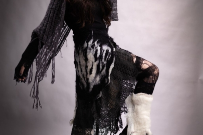 Júlia anyaghasználata legfőképpen a fekete szín köré épült, sőt a sminkjében is erőteljesen visszaköszönnek a fekete, a szürke és az ezüstös színek. Júlia a nedves nemezelés technikájával a projekt során találkozott először. „Az anyagok összeillesztése nem okozott gondot, a legnehezebb rész talán ezeknek az összeállítása volt. Az elképzelés a valóságban általában mindig kicsit máshogy néz ki, főleg akkor, ha a felhasznált anyaggal nem dolgozunk gyakran vagy az teljes mértékben ismeretlen számunkra. Igazából ez is a feladat része, hiszen próbára tesz az, hogyan hozod ki a meglévőből a tőled telhető legjobbat. Amit még a kivitelezésben nehézségnek mondanék, az az anyag befestése volt. Volt olyan anyag, amelyet sikerült nagyon szépen befesteni feketére, viszont volt olyan is, amelyen a szín sötétkéknek látszott” – mesélte Júlia.