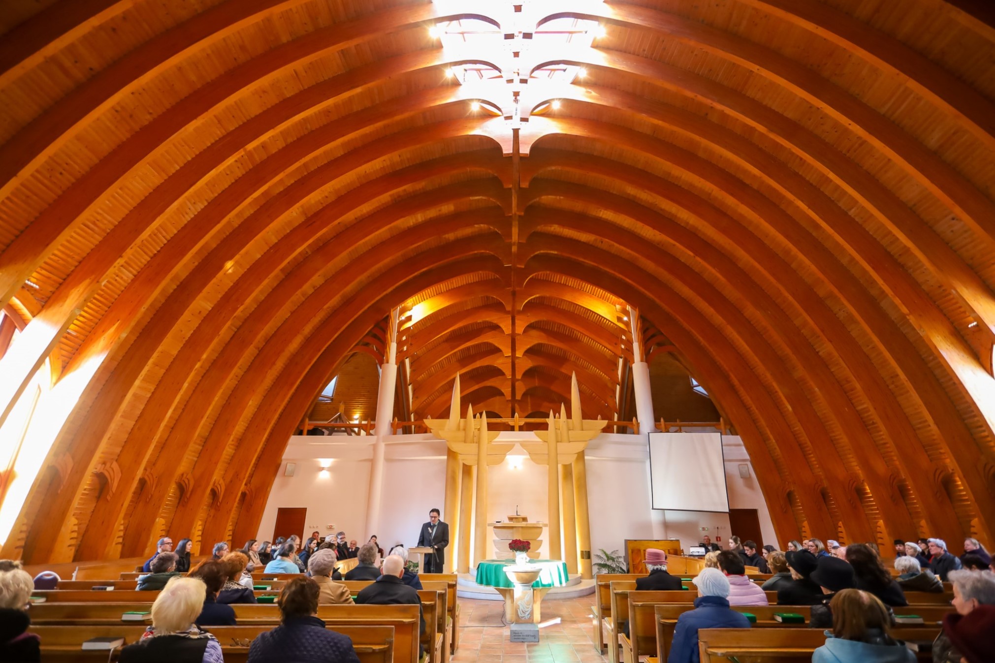 A lelkipásztor szavait Krasznai Noémi Ilona kántor és Marczi Ernő orgonista váltották fel, akik közösen adták elő A virágok vetélkedése című népdalt a jelenlévők számára. A Makovecz Imre által tervezett organikus templomot a hit és otthonunk melege árasztotta el, s az előadott népdal gyermekkorunk anyaszemélyeinek emlékével simogatta a közönség lelkét.