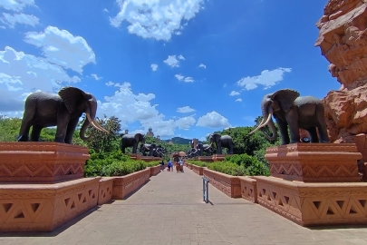 A következő napon gyalogosan jártuk be Sun City-t. A modern üdülőközpontot 1979-ben, Johannesburgtól kb. 150 km-re északnyugatra hozta létre Sol Kerzner, litván származású zsidó, akinek szülei a 20-ik század elején vándoroltak ki az akkor Oroszországhoz tartozó Litvánia területéről. Sun City az alapításakor egy kaszinóváros és szórakoztató központ volt. Aztán kitalálták hozzá az Elveszett város legendáját, és meg is építették 1992-ben. A Lost City (Elveszett város) nevű nagy kiterjedésű új városrészbe a Dzsungel ösvényen, majd az Idő hídján, elefántszobrok sorfala között jutottunk be. Az Elveszett városban egy képzelet szülte ősi civilizáció tárul a látogató elé. Van itt minden, amit az ember ősidőktől napjainkig a szórakoztatás érdekében kitalált: őskori barlangrajzok, ókori amfiteatrum, mesterséges vízesések és strandok, játékkaszinók, luxus bevásárlóközpont, egzotikus éttermek, golfpályák és egyéb sportlétesítmények. Mindezt végigjárhattuk, megnézhettük egyszerűen csak azért, mert Sun City-ben szálltunk meg. A Lost City városrésznek az úgymond koronája viszont a briliáns, gyönyörű Palota. Megszámlálhatatlan lépcsőfok vezet fel a Palotához, amely osztályon felüli luxusszálloda. Ezt azonban csak kívülről láthattuk, a kapuja nem tárult fel előttünk.