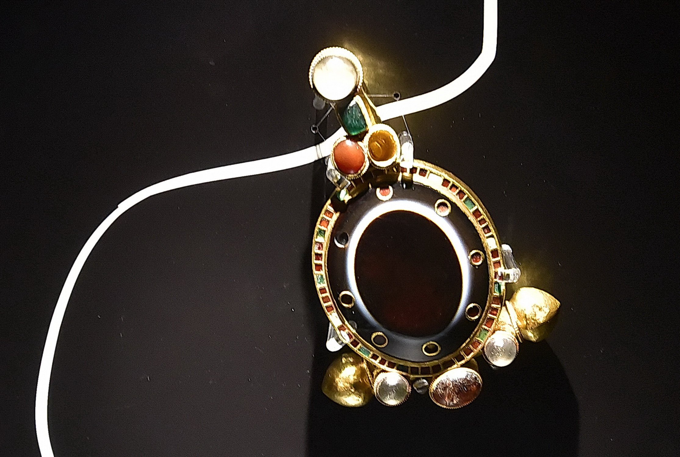Csodálatos darabja az első szilágysomlyói kincsleletnek egy aranyból készült díszlánc füstkvarc gömbcsüngővel. A láncon sok kisebb, fegyvereket és munkaeszközöket ábrázoló csüngő is díszeleg, ez az alkotás is látható a tárlaton.