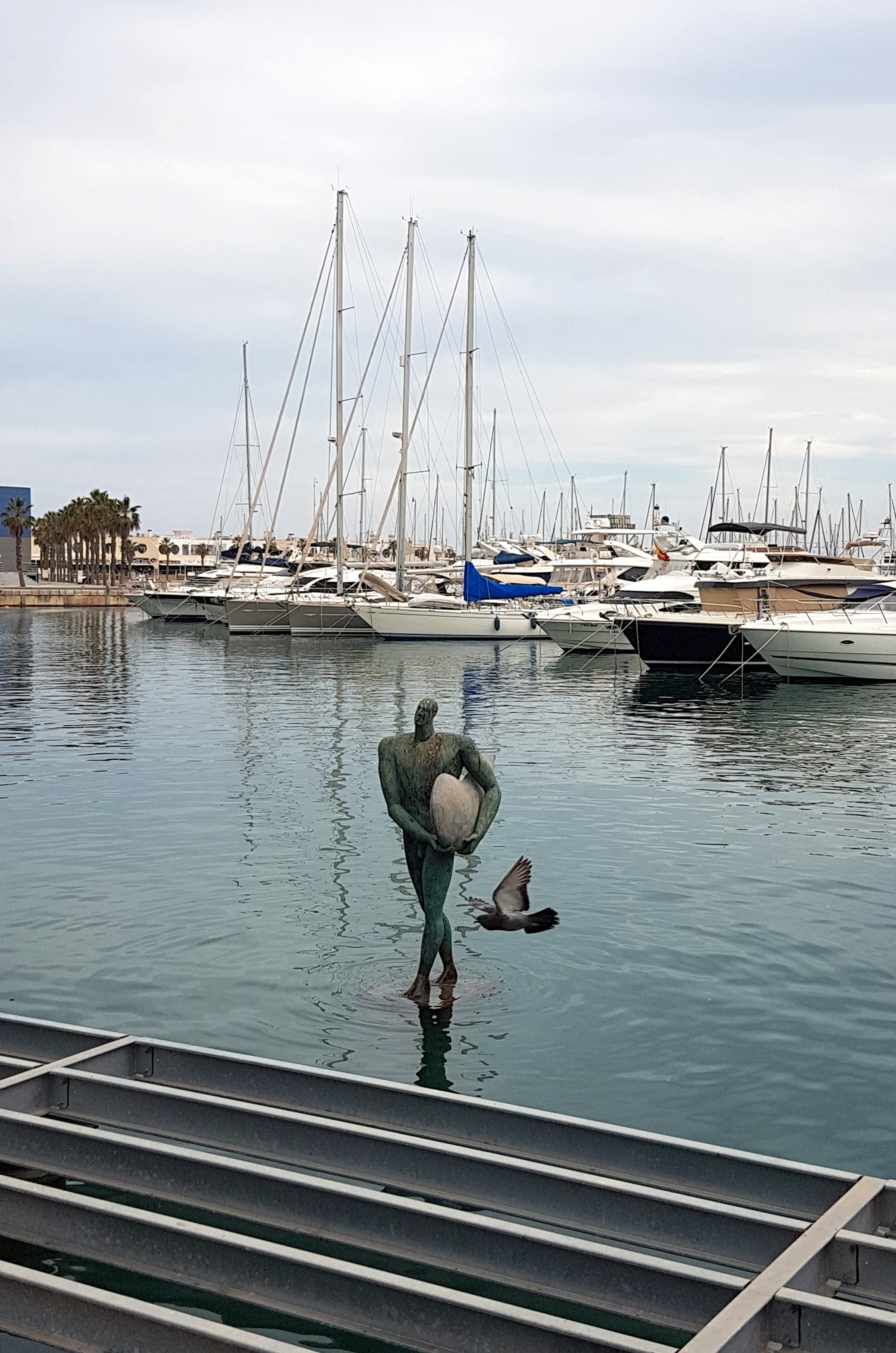 Azt hinnéd, valami egzotikus botanikus kertben sétálsz, ha álomsétádat lépten-nyomon nem csillogó-villogó portékákkal, ajándéktárgyakkal, Alicante-matricás pólókkal megrakott vásáros bódék szakítanák félbe. A sétány mellett húzódó belső kikötőben az elegáns jachtok között sirályok lejtik csendes táncukat, a külső kikötőből a kereskedelmi hajók búgása hallatszik. A kikötő belső dokkjának vizében Esperanza d'Ors 1999-ben készült A szörfölő Ikarusz visszatérése nevű bronzszobra néz a part felé. Ikarusz, a talapzatra helyezett meztelen férfialak mintha a tenger felszínén járna, szárnyak helyett szörfdeszkát hord a bal karja alatt. A spanyol szobrásznő szerint ez az alkotása „tisztelet mindenki előtt, aki repülni és álmodozni próbál”.