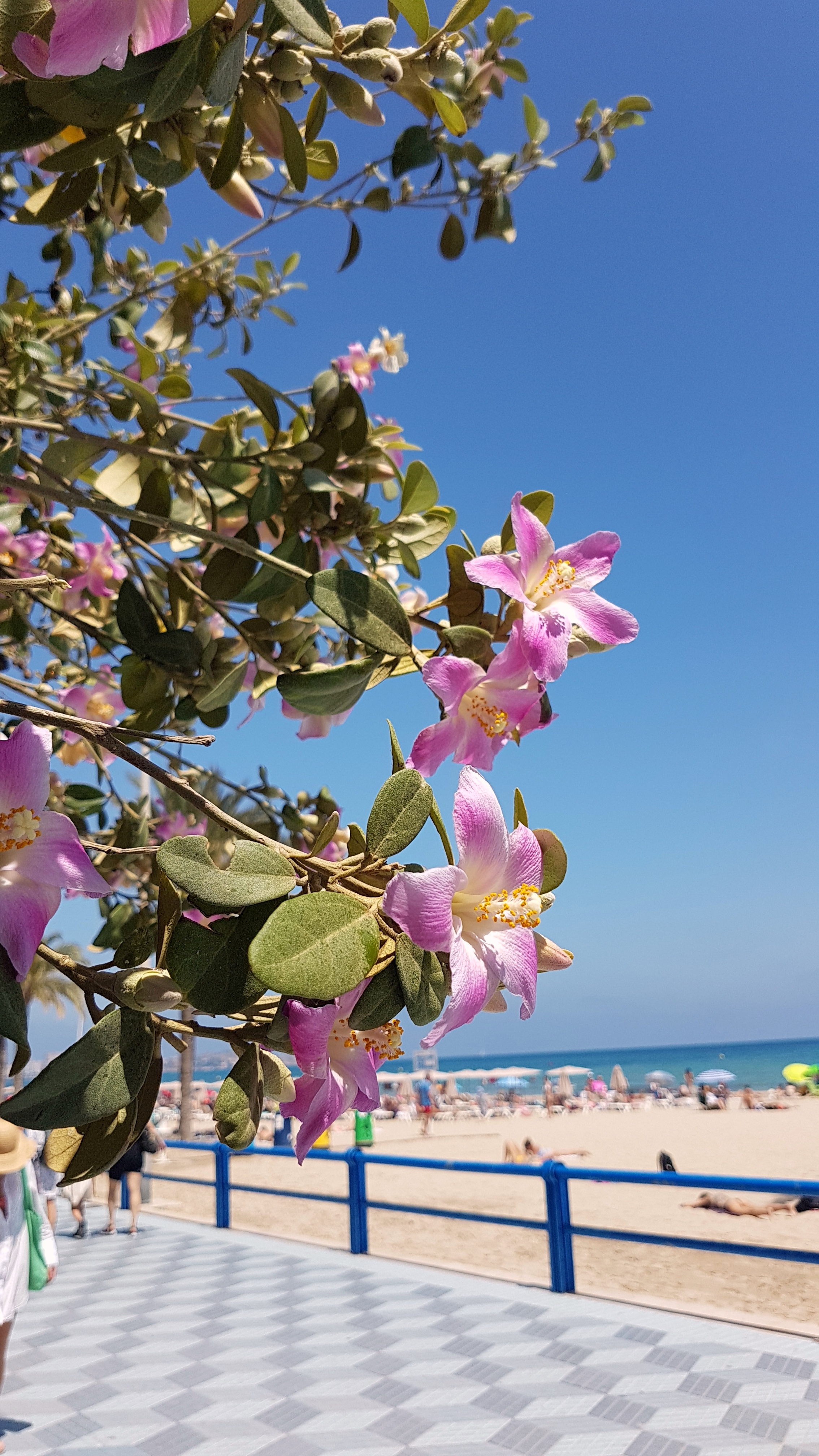 A Plaza de la Puerta del Mar és a Plaza del Puerto között újabb modern szobor hívta fel a figyelmünket. Az El divinador (A jós) bronzból készült, körülbelül négy tonna súlyú, 3,5 méter széles és közel 8 méter magas absztrakt szobor, amelyet maga Juan Ripollés szobrászművész ajándékozott a városnak 2010-ben. Az alkotás többarcú emberi alakot ábrázol, amelynek nagy méretű tojásdad fejdíszéből számok állnak ki. Sajnos 2022 márciusában a szél- és esővihar ledöntötte a szobor felső részét, így mi csak a megcsonkított „jóst” láthattuk. A szobor restaurálása ügyében a város vezetősége már egyeztetett a művésszel, hogy a groteszk alkotás mielőbb visszanyerje eredeti formáját. Sétánkat a Playa del Postiguet, a lisztfinom, fehér homokos városi strand irányába folytattuk. A rózsaszínűt virágzó lagunáriákkal szegélyezett parton sétálva kicsit megirigyeltem a tenger hullámaiban fürdőzőket, a puha homokban napozókat és a pálmafák árnyékában pihenőket, tudván, hogy már csak néhány óra, és vége az álomvakációnak. Aztán kicsit megráztam magam, majd Kingámmal percekig összeölelkezve, hálával a szívemben, némán elbúcsúztam a napsütötte Földközi-tenger azúrkék vizétől és a spanyol csodáktól, amelyekben Valenciától Alicantéig annyi örömöt leltem.