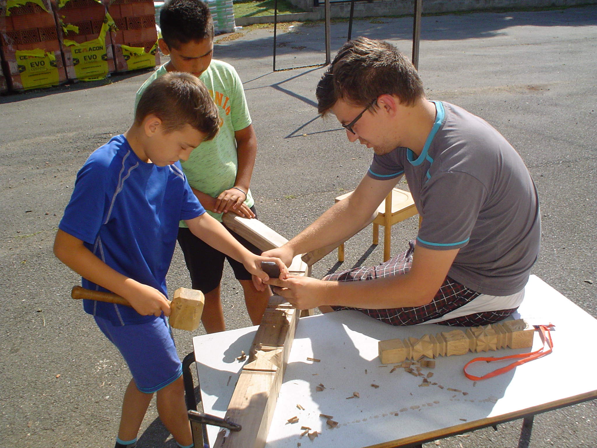 A gyerekek több kézműves foglalkozás világába is betekintés nyerhettek az oktatók segítségével. Fafaragásra az érdekelteket Both-Máté Dénes és Benk András tanár tanította, akik kitartó munkával szépen elsajátították a mesterséget. A gyöngyök világába Böndi Katalin tanítónő vezette a diákokat, akik a hét folyamán türelmesen és kitartóan ügyeskedtek, így szebbnél szebb karkötőket és nyakláncokat fűztek. A táncoktatással Póka Jácint-Tivadar és Bálint Orsolya-Mónika foglalkozott. Laczi Júlianna-Zsófia tanítónő és Péter Mónika-Mária magyartanárnőtől leshették el a kíváncsi gyerekek a vagdalálos illetve a nagyírásos varrások csínyját-bínyját. Így, a táborban a gyerekeknek sikerült ügyesen megvarrt terítőkkel és nyakékekkel büszkélkedniük. Vincze Jancsi Tímea tanítónő segítette a diákokat, hogy szebbnél szebb virágtartókat készítsenek. A gyerekek mindemelett fonalgrafikázhattak is, hiszen a táborban a sok-sok mesterség mellett, ezt is ki lehetett próbálni. A fonalgrafikázni vágyókat Márton Ildikó-Beáta, az iskola volt diákja tanítgatta. Péter-Jani Bianka az érdeklődőknek bogozásra oktatta, immár második alkalommal. A gyerekek nagyon kitartóak voltak, hiszen egy karkötő elkészítése időigényes. Sokan a táborban találkoztak először a technikával, és az sem könnyített a helyzeten, hogy sokszor ki kellett bontani a rosszul kötött csomókat. Ennek ellenére minden nap akadtak érdeklődök, köztük egészen fiatalok is, sőt olyanok is, akik több karkötőt is készítettek.