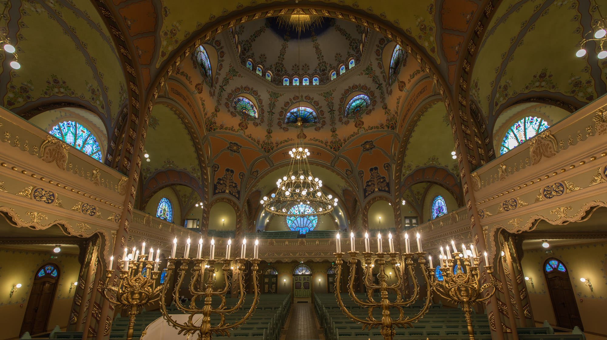 A bejáratnál kapott szórólapból megtudjuk, hogy az 1902-ben felszentelt, nemrég teljesen felújított vallási épületet a városban élő mintegy 3400 izraelita használta. A zsinagóga földszinti része okkerbarna színekből indul ki, ami Júdea földjét szimbolizálja, azután felfelé haladva áthajlik a rózsaszínbe, majd a magasban világoskékbe árnyalódik, míg a kupola magasságában már a mélykék dominál.
