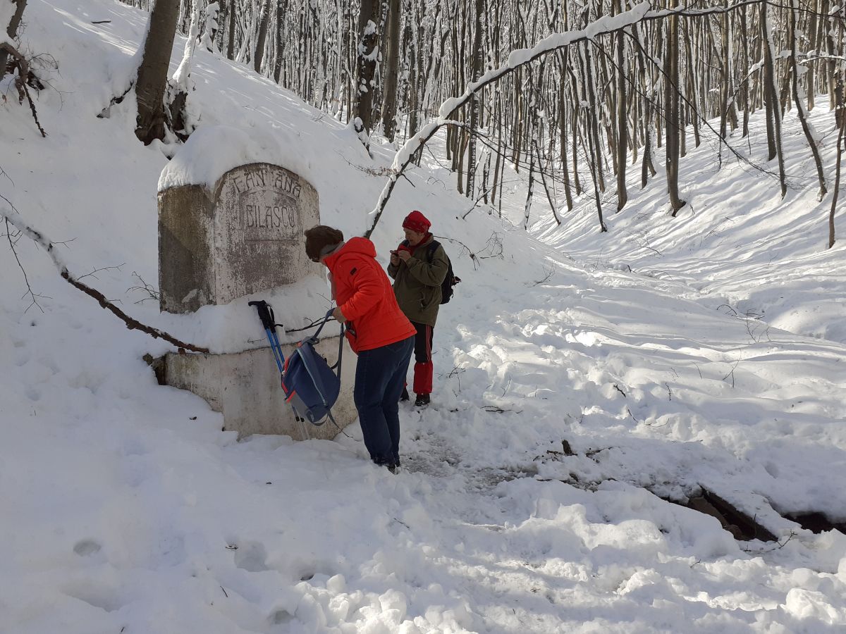 Elhaladtunk a Rajka-forrás mellett – az ösvényen a hatalmas gömbkövet vastagon belepte a hó –, kimásztuk az emelkedőt, majd a kék sávon folytattuk utunkat a Majláth-kúthoz vezető ösvényen. A kutat 1905. szeptember 17-én avatta fel az EKE, nevét Gr. Majláth Gusztáv Károly (1897–1937) gyulafehérvári püspökről, az EKE alapítótagjáról és támogatójáról kapta. Kolozsvár román természetjárói a kutat Gheorghe Bilașcu (1863–1926) kolozsvári orvosprofesszorról nevezték el, a forrást jelölő kövön ez a név szerepel. Vizet vettünk, majd tovább haladtunk a kolozsvári Bükk-erdő legszebb részén, a legrégebbi (kékkel) jelzett turistaútján. Nemsokára elhagytuk a kék jelzést, amely az Árpád-csúcsra visz, átkeltünk a patakon, kereszteztük a piros kereszt jelzést és a szelicsei útra ereszkedtünk. Az Árpád-csúcs alatt, a Szelicsei úttól északra terül el a Bivalyos-rét, a nagy füves területen nyáron juhokat legeltetnek, olykor kecskéket, bivalyokat. Most persze itt is hó borított mindent. Kissé meglepett, amikor kiléptünk az erdőből a szelicsei útra, hogy az aszfaltos út mindkét oldalán hosszú sorban álltak az autók, sokan jöttek ki ide gyerekekkel, szánkókkal, sílécekkel kihasználni a megkésett csodálatos téli napot, furcsa módon épp az első tavaszi napon. A felhőtlen kék égről fényesen sütött a nap, szinte sértette szemünket a hótakaróról visszaverődő erős fény.