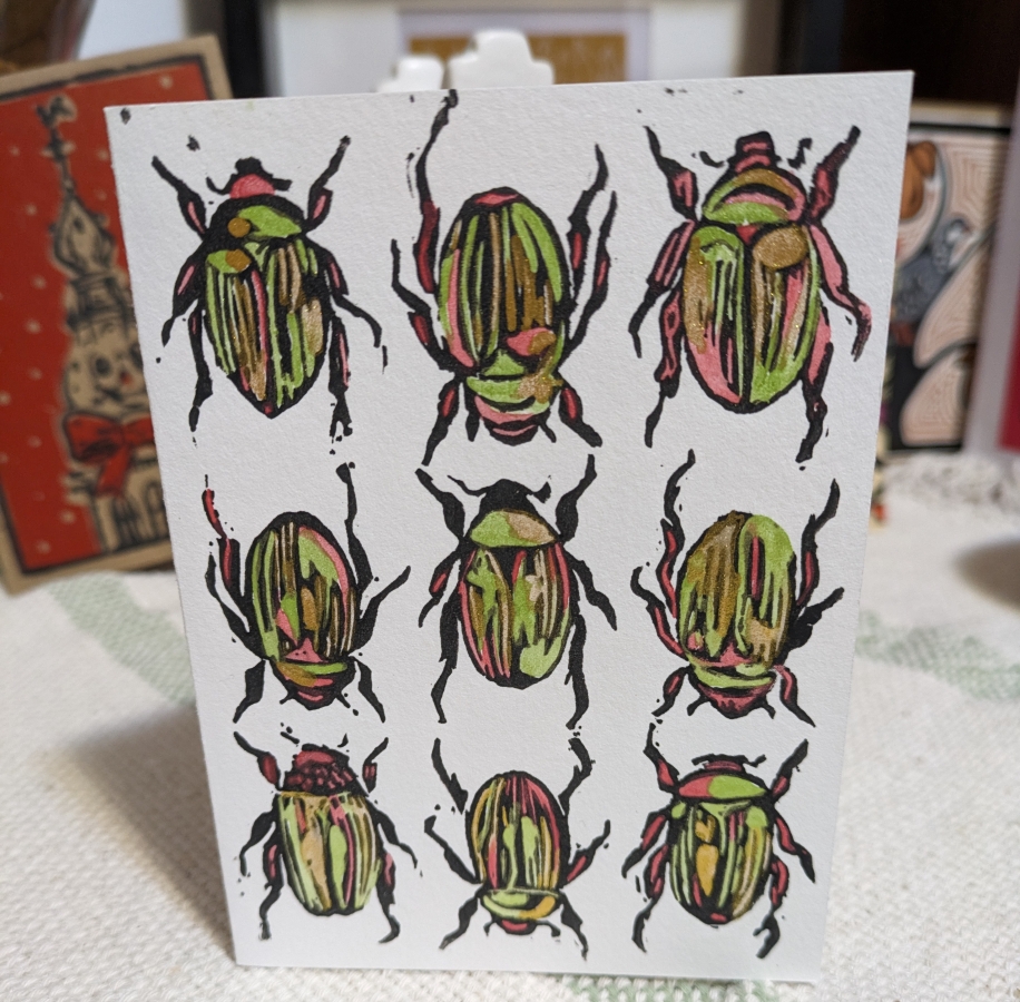 Egy idegen helyről az otthoniaknak küldött képeslap számos izgalmat nyújt: ízléses lapot kell találni, utána postát kell keresni, majd itthon is tovább lehet folytatni az izgulást, hogy vajon mikor érkezik a lap. Később el lehet mesélni, hogy milyen kalandok útján került bélyeg, hiszen már sehol nem olyan egyértelmű a posták működése, mint néhány évtizeddel ezelőtt. Például idén Bécsben egy automata postát sikerült csak találunk, ahol vonalkódos bélyeget nyomtatott a gép, postáskisasszonynak, postamesternek nyoma sem volt. Sőt, postaláda sem volt, egy nagy gép nyelte el a küldeményt, amit méret és súly szerint egyből osztályozott is. Szerencsénkre (vagy sem?) a romániai posták ilyen fokú automatizálása egyelőre nem fenyeget, amikor november elején bementem, hogy tizenöt bélyeget vegyek a karácsonyi képeslapcserére, még azt is megbeszélhettem a postai alkalmazottal, hogy almát vagy paradicsomot ábrázoló bélyeget kérek. Végül az almákra esett a választásom, így azok vitték szét a világba a linómetszet-képeslapjaim. Ugyanis idén vettem részt a második nyomat-cserémen (angolul print exchange, ha valakit érdekel, így találja meg), amióta különböző sokszorosító grafikai eljárásokkal kísérletezem.