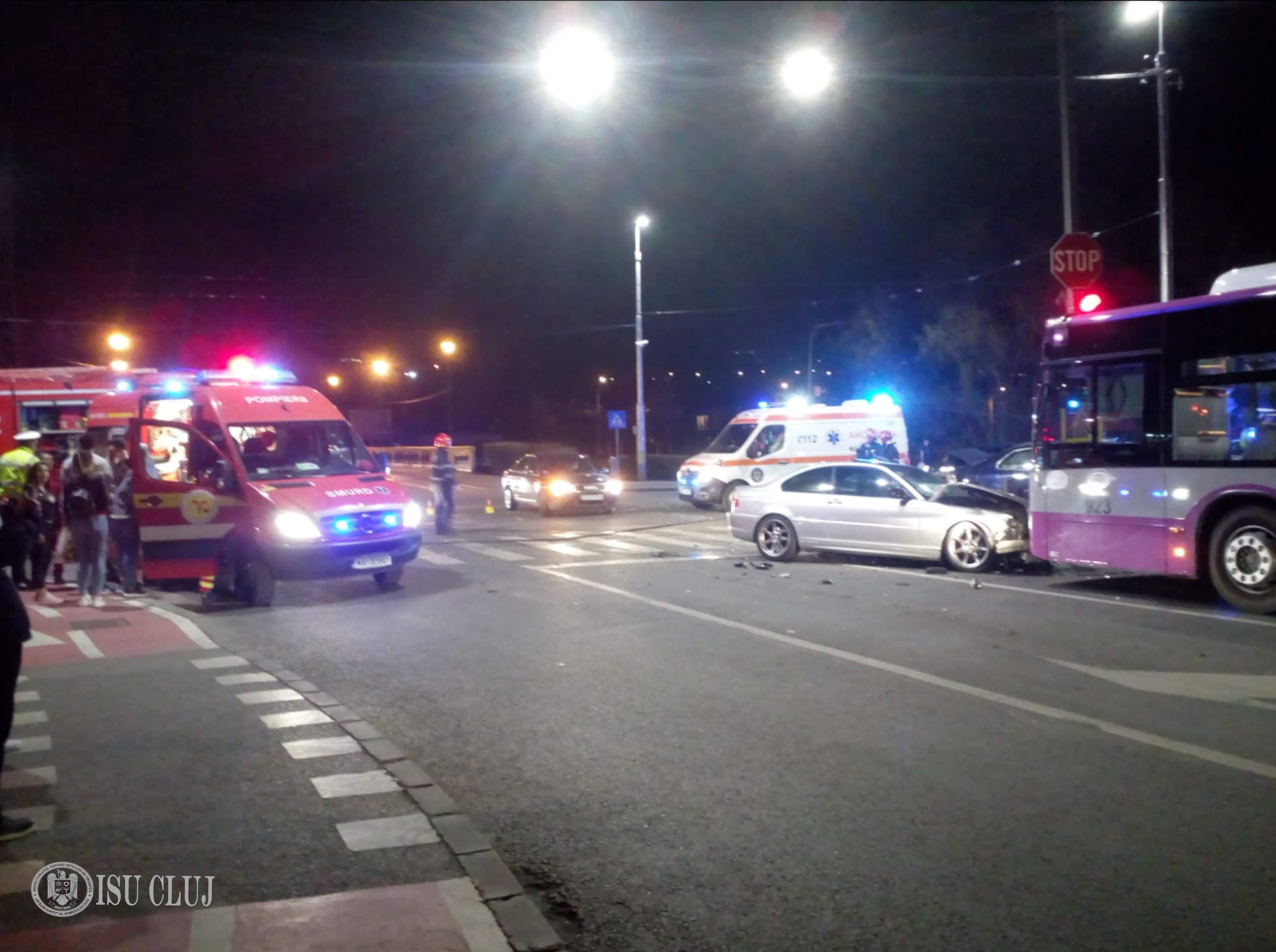 Öt személy, köztük három gyalogos megsérült, amikor vasárnap éjjel kolozsvári Garibaldi híd közelében összeütközött két személygépkocsi és egy autóbusz.