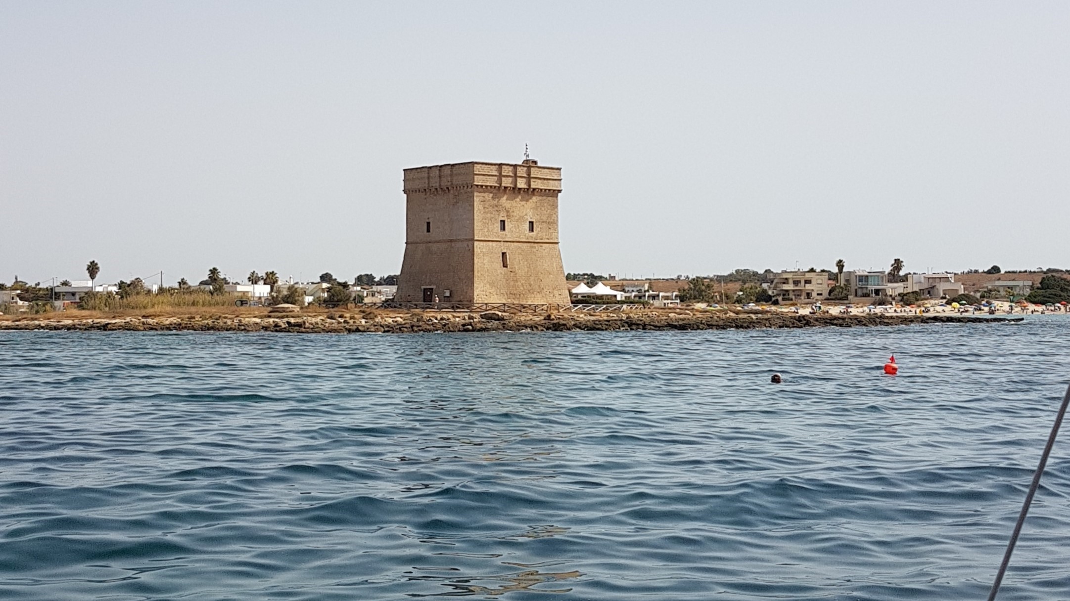 Mi is beneveztünk egy hajós kirándulásra, de nemcsak erre a szigetre voltunk kíváncsiak, ugyanis Szabolcsom amolyan játékkinézetű búvárfelszerelést vásárolt, hogy azzal közelről is megnézhesse a tenger mélyén fekvő görög–római oszlopokat a Torre Chianca közelében. A jókötésű, vidám Gianni megígérte, hogy motoros bárkájával csupán néhány euróért körbehordoz, sőt ki is szállhatunk fürödni az őrtorony által „védett” tengerben, majd később visz el az Isolára, ahol addig ülhetünk, amíg jólesik, aztán, ha meguntuk, hívjuk őt mobilon, és majd utánunk jön.