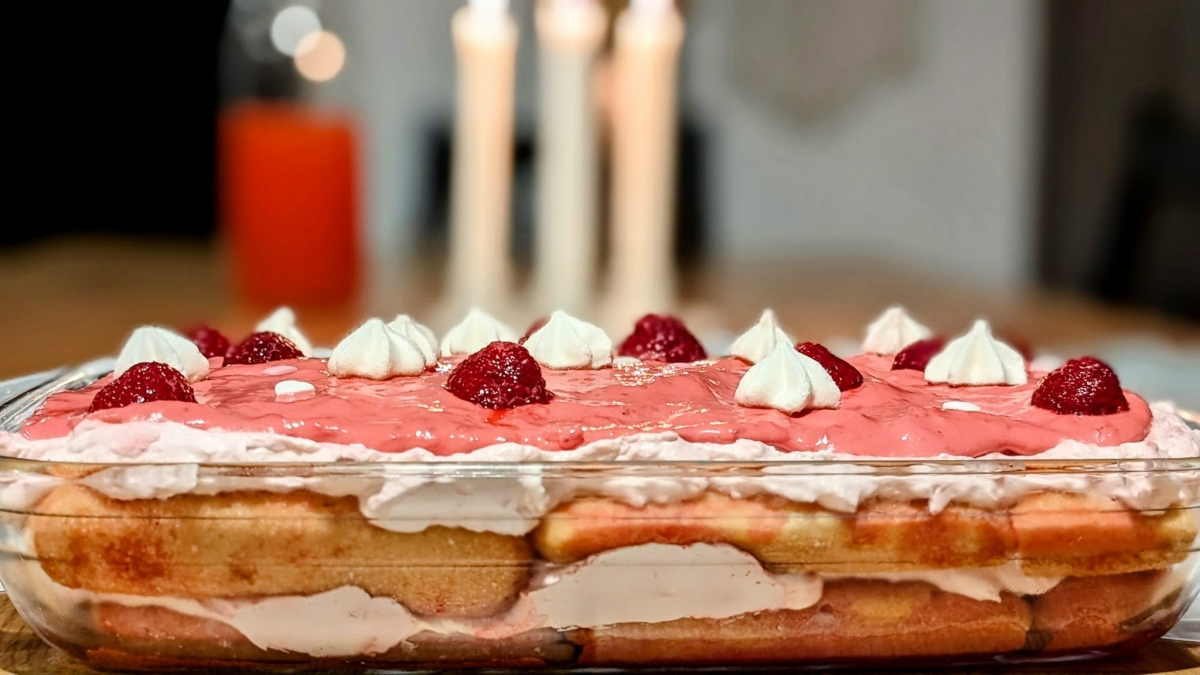 Iskolás-, munkásnaphoz alkalmazkodva olyan ünnepi menüt kellett kiötölnöm, ami jelzi a nap fontosságát, gyermekkedvenc, s nyilván könnyen és rekordidőn belül elkészíthető. Ennek a menünek a zárófogása lett ez a málnás tiramisu. Azért azt el kell mondanom, hogy e sütésnélküli desszertnek csupán annyi köze van a tiramisuhoz, hogy babapiskótával és mascarponéval készül, de ettől még mutatós és finom.