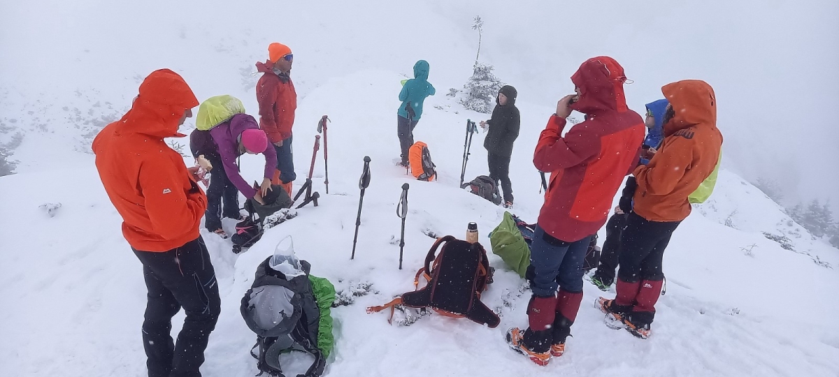 Borongós idő és köd kísérte az utunkat előbb a lombhullató fák között, majd a fenyőerdőben, ezt követően pedig az alpesi tisztáson teljesen hatalmába kerített a hó. Azonnal tudtuk: védekeznünk kell a hó és a köd eredményezte teljes fehérség, az úgynevezett whiteout ellen, amely a téli magashegyi túrázás és alpinizmus egyik legveszélyesebb meteorológiai-percepciós jelensége, mert nem pusztán rossz látási viszonyt jelent, hanem az emberi érzékelés teljes összeomlását is okozhatja.