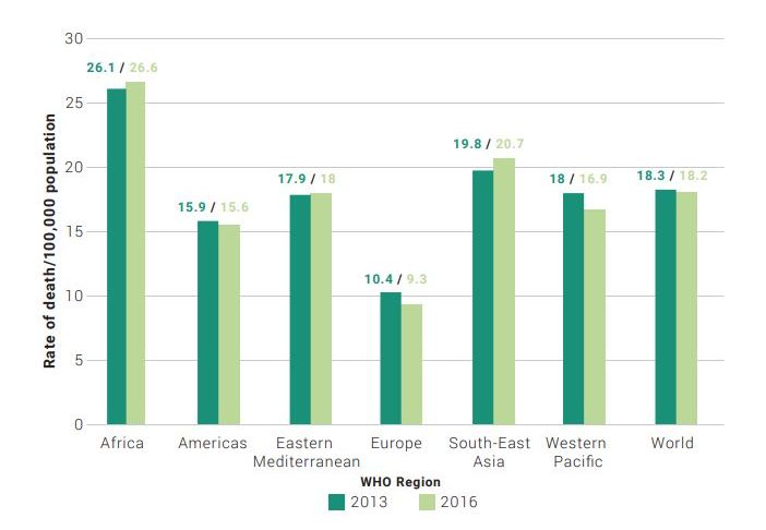 Minden 24. másodpercben meghal egy ember közúti baleset miatt a Földön. Naponta 70-en, hetente 500-an halnak így meg az Európai Unióban. Több halálos áldozata van a közúti baleseteknek, mint az AIDS-nek. Négy áldozatból egy gyalogos vagy biciklis, egy másik pedig motorral közlekedett. A kisjövedelmű országokban háromszor nagyobb az elhunytak száma, mint a magas jövedelmű országokban: a kisjövedelmű országokban birtokolják a világ járműveinek 1%-át, de itt történik a halálesetek 13%-a, a magas jövedelmű országokban a világ járműveinek 40%-a a halálesetek 7%-át okozza. Afrikában 1 millió főre 266 haláleset jut évente, Európában 93. A WHO 2-3 évente ad ki többszáz oldalas jelentést a közúti biztonságról, legutóbb 2018 decemberében, amikor az előző jelentéshez képest csökkent a közúti halálesetek száma Amerikában, Európában és a Csendes-óceán nyugati térségében. Általában minden negyedik áldozat gyalogos vagy biciklis, Afrikában szinte minden második. A motorbiciklivel közlekedők teszik ki az áldozatok több mint negyedét, de ez az arány 43% Délkelet-Ázsiában.