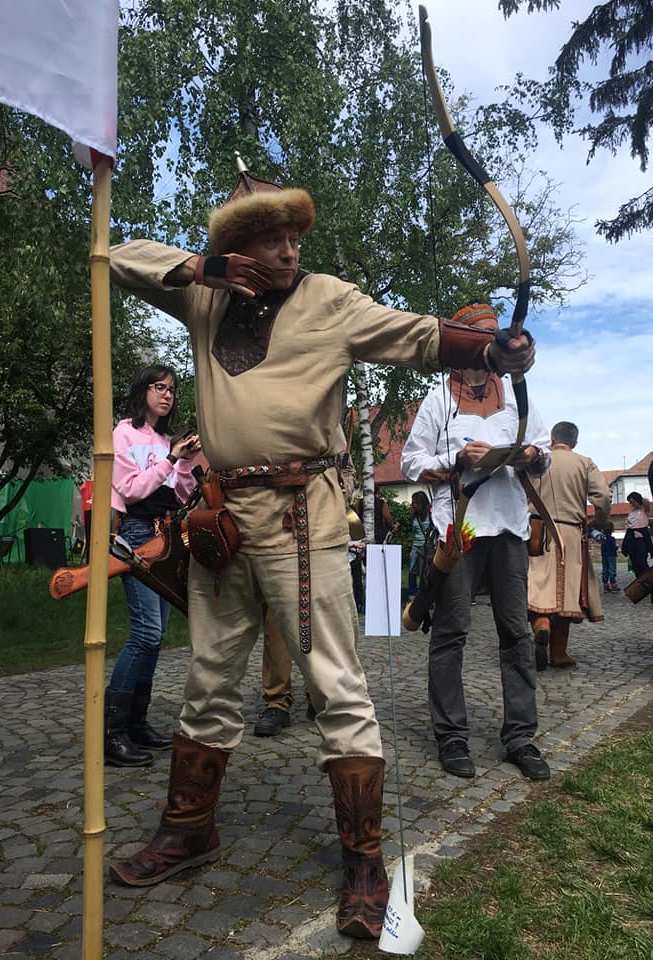 A történelmi séta után egy hatalmas, több mint szász éves diófa árnyékában a honfoglaló magyarok rettegett fegyverét, a visszahajló összetett íjat mutatták be az egyesület tagjai az érdeklődőknek, akik ki is próbálhatták az íjak használatának módját.