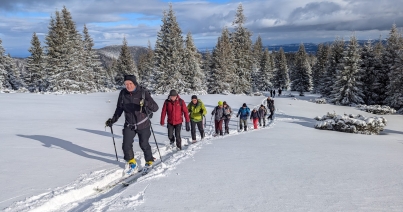 Miután kigyönyörködtük magunkat és az uzsonnánkat is elfogyasztottuk, visszaereszkedtünk a nyeregbe, majd a piros pötty jelzésen haladtunk tovább, amíg el nem értük azt az elágazást, ahol az eredeti terv szerint fel kellett volna térnünk a kék pöttyön. Mivel lassan már két óra késésben voltunk és a csapat néhány tagjának vészesen csökkent az energiaszintje, túravezetőnk úgy döntött, hogy lerövidítjük az útvonalat és a gerincen haladva visszaereszkedünk Havasrekettyére. Az ambiciózus, öttagú csapat viszont ragaszkodott az eredeti tervhez, így szétváltunk és ők elindultak a kék pötty jelzésen. Mi újabb ebédszünetet iktattunk be, közben pedig a nap meleg sugaraiban fürdőztünk, de voltak, akik hóembert is építettek. Tovább indulva folyamatos ereszkedés várt ránk, sokan viszont most jártunk először ezen az útvonalon, így meglepetést jelentett minden lépés a 4 km-es távon, a völgyben fekvő Havasrekettye idilli látványa pedig csak fokozta hangulatunkat. Menetelés közben néhányan kellemes beszélgetésbe elegyedtünk társainkkal, így szinte észrevétlenül tettük meg a hátralevő utat. Visszaindulva a kincses városba, még gyönyörködhettünk a hófödte dombokban, miközben lelki szemeink előtt újrajátszottuk az átélt felejthetetlen pillanatokat, az égiek pedig bíbor naplementével koronázták meg különleges élményeinket.