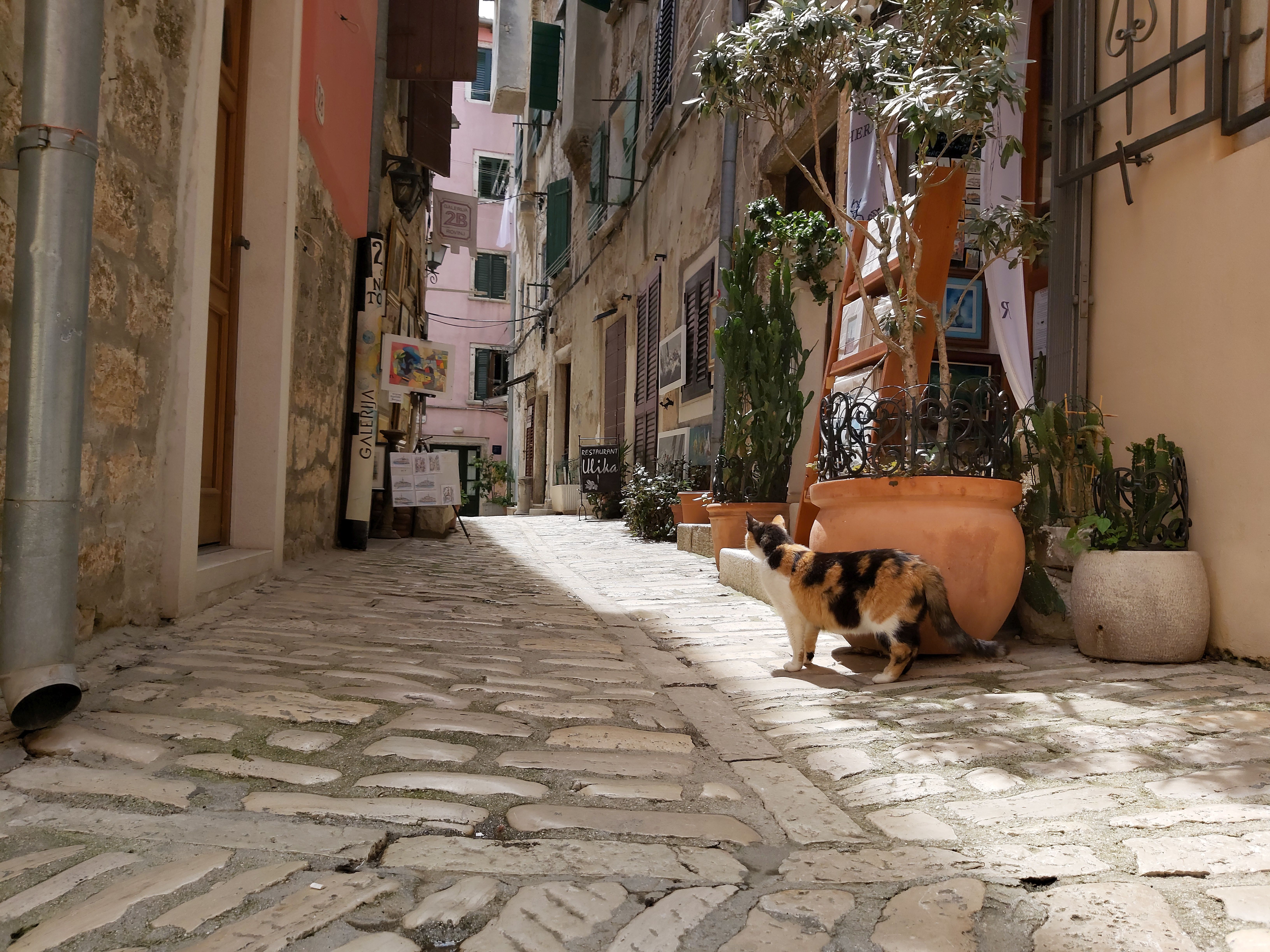 Egyik helyen sem készítettünk annyi fotót, mint Rovinjban: a szűk, kőlapokkal ellátott utcák, a szárítón lógó ruhák, sok-sok macska, az utca végén hirtelen megjelenő tenger… A sziklának csapódó hullámokat hosszú percekig néztük, élveztük a teljes szabadságérzetet biztosító látványt.