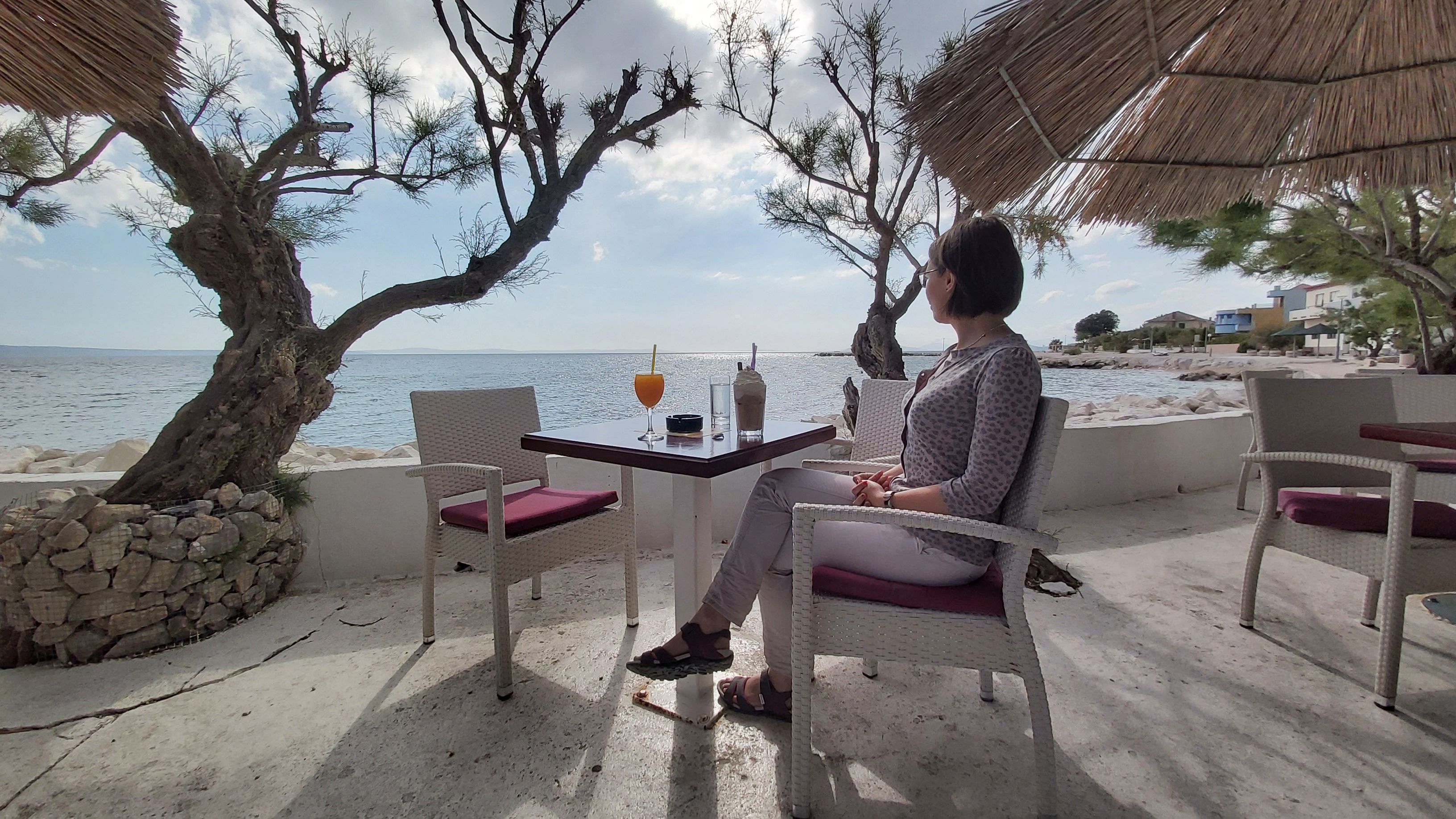 A hétfői programban a Rijeka/Fiume irányába az Adriai-tenger partján vezető út szerepelt. Több helyen megálltunk, élveztük az üres tengerpartot, egy csodálatos kilátással rendelkező kávézóban még fogyasztottunk is valamit - ritka alkalom az igen alacsony költségvetésű utazók számára.