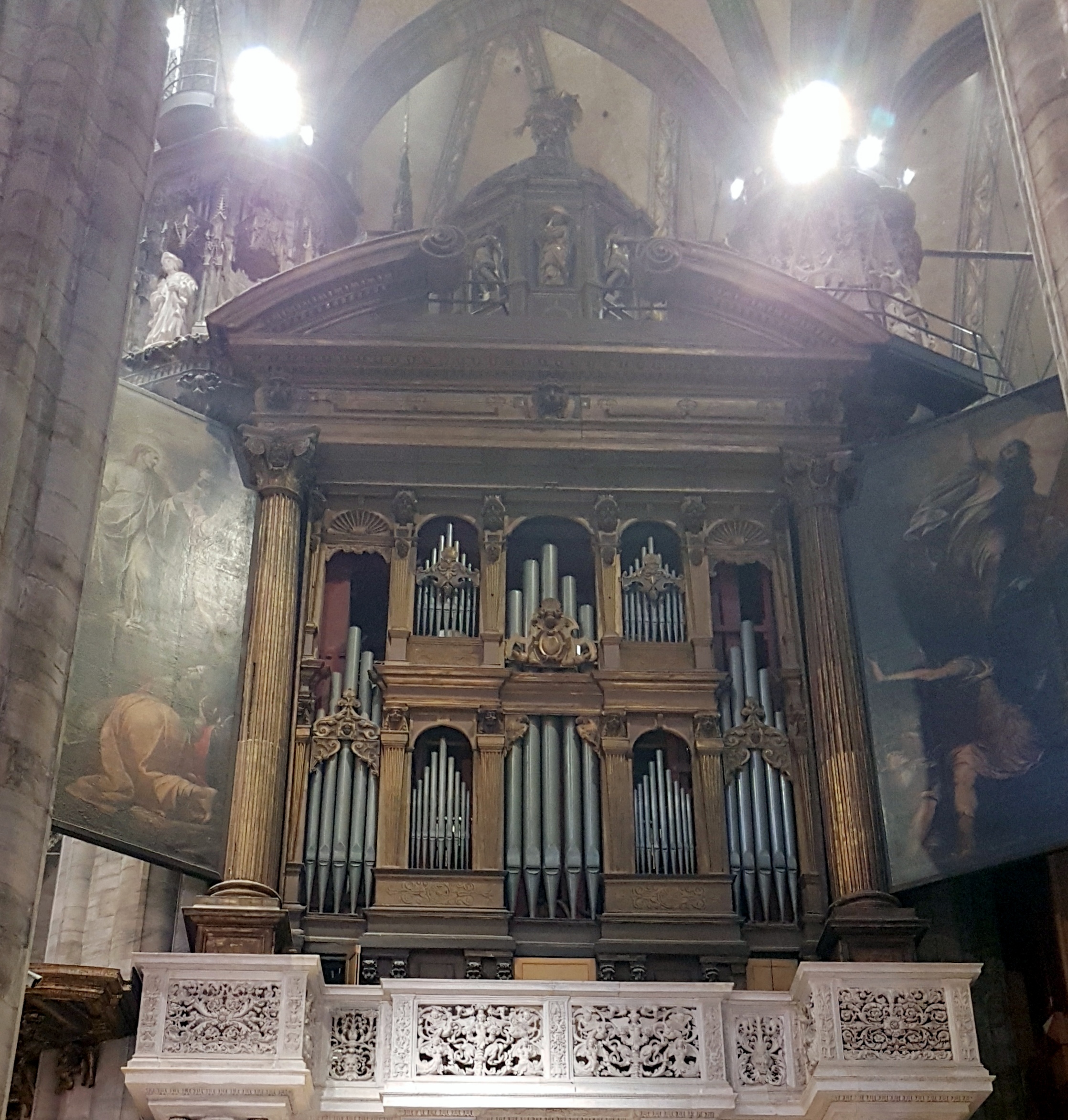 Utazásaim során csodálatos templomokban jártam, de amikor beléptünk a magasság, mélység és meghitt csend uralta istenházába, a virágmintás, csillogó márvány mozaikpadlón valósággal földbe gyökerezett a lábam, a meghatódottságtól percekig egy tapodtat sem tudtam lépni, s mint még soha, zokogni kezdtem, könnyeim a sok szellemi kincs láttán egyre csak peregtek. A színes üvegablakokon beszűrődő napfény megvilágította a nagyméretű freskókat, oltárképeket és festményeket, minden olyan földöntúli szép ragyogást nyert. Nem is tudnám a templombelső minden csodáját felsorolni, de néhány értéke, mint a Milánót védelmező Madonnina aranyló másolata és a püspökök síremlékei, az adományozójáról Trivulzio-kandelábernek nevezett 1210-ből való hétágú bronz gyertyatartó, Gian Giacomo Medici síremlékének domborművei és bronzszobrai, fölötte a Corrado di Michis készítette (1564-ben) egyik legszebb üvegablak, valamint a Jézust a keresztfán ábrázoló nagyméretű, díszes arany ötvös remekmű, mind-mind különös hangsúllyal véste be magát emlékezetembe. Mély nyomot hagyott bennem az életnagyságú Szent Bertalan-szobor is, Marco d’Agrate (1504–1574) remekműve: a reneszánsz szobrász a kínhalált szenvedett apostolt saját lenyúzott bőrét a kezében tartva ábrázolta elképesztő anatómiai precizitással, nyers realizmussal.