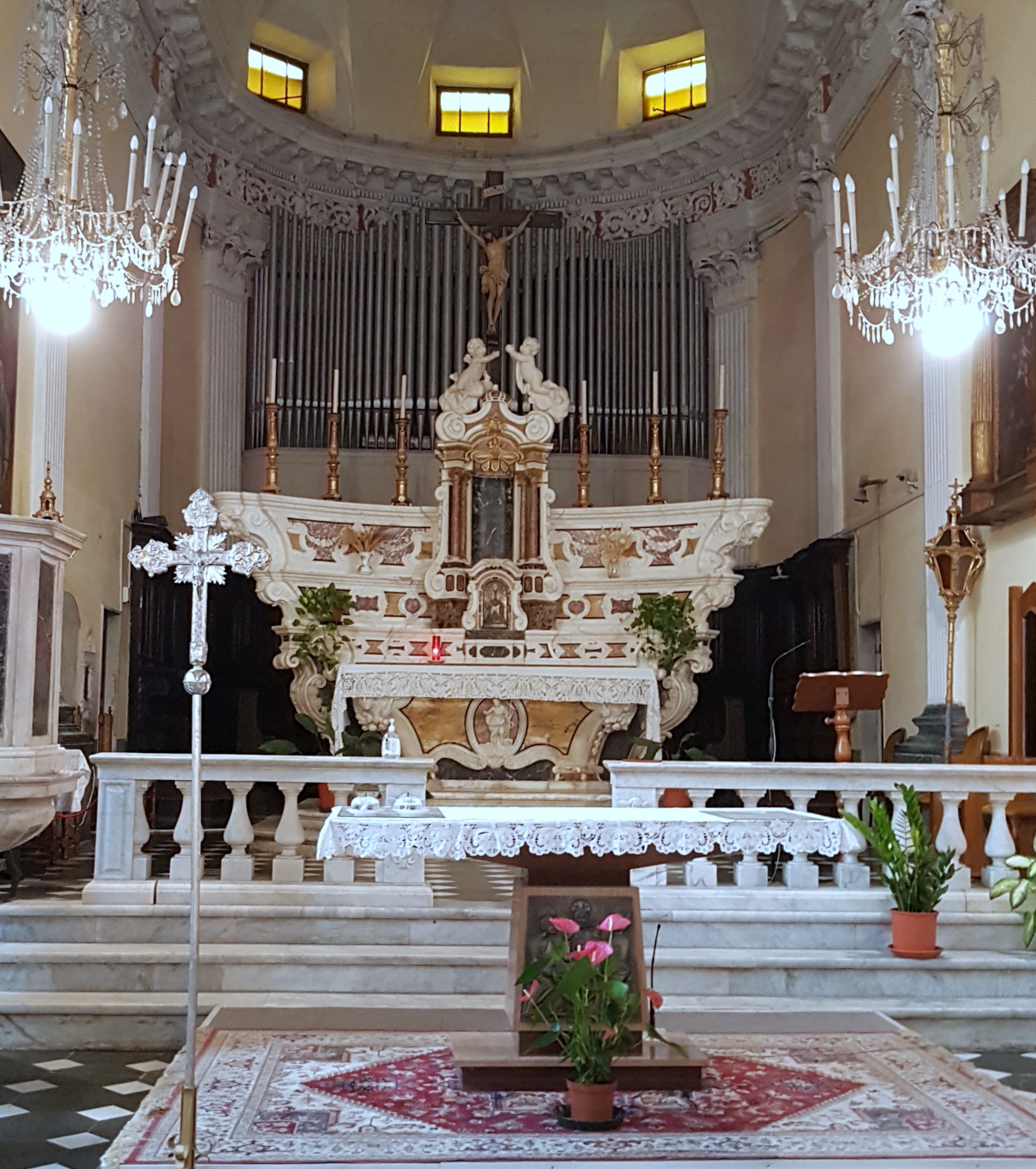 Nos, régi templomot nemcsak a hegyen, hanem Monterosso óvárosában is láttunk, nem is egyet, hanem kettőt egymás mellett. A La Chiesa di San Giovanni Battista, vagyis a Keresztelő Szent János-templom az 1200-as években épült. A barokk kori és újabban 1963 és 1964 közötti átalakítások a ligúriai gótikus építészet remek példáját eredményezték. A templom homlokzata jellegzetesen váltakozó fehér és sötétzöld szerpentinmárvány-díszítésű, ovális portállal, fölötte a Krisztus megkeresztelkedését ábrázoló 18. századi freskóval. Középső rózsaablaka Matteo és Pietro da Campiglio remekműve, a gótika ékes példája. A napkorong alakú rozetta apró ablakain besütő nap bearanyozza a különben elég sötét templomot, amelynek belső terében fehér és sötétzöld csíkos márványoszlopok váltakoznak. A templom kulturális-egyházi értékei között megemlítendő az 1360-ból származó keresztelőkút, Luca Cambiaso Madonna del Rosario festménye, valamint az 1734-ből származó barokk főoltár. Amikor az oltár mögött megszólal az orgona, az egész templom mintha égi fényben ragyogna, hangja megtölti a hívek szívét jósággal és boldogsággal.
